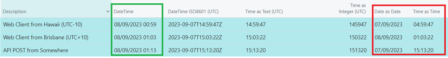 DateTime: consistently in UTC and always displayed in local client Time Zone (Brisbane, in the example just shown).