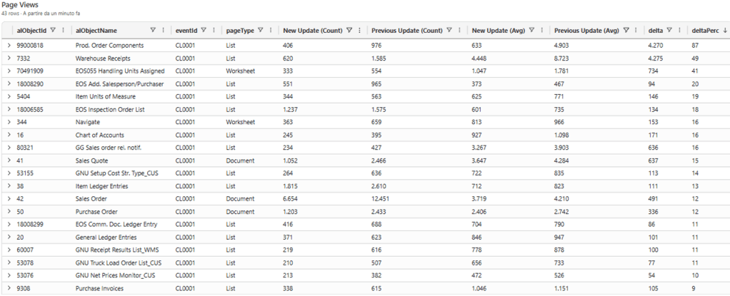 Just to prove the point, I am concentrating on Lists and few other page types, and the results are self-explaining. Previous update means 25.x, New Update means 26.x. I took the number of occurrences per period (Count) and the average time in milliseconds. Delta and delta % are the raw and percentage difference between the different period’s average times.