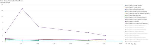 Error Dialog Timeline by failure reason time chart, to monitor the evolution in time of different failures.
