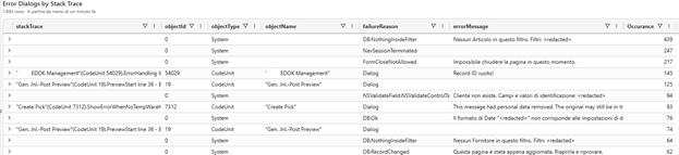 | summarize Occurance = count() by stackTrace, objectId, objectType, objectName, failureReason, errorMessage