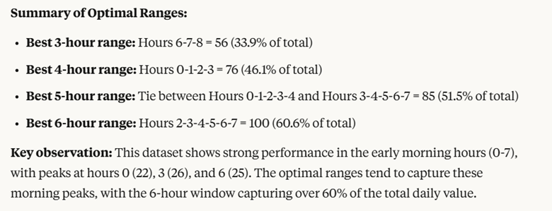 And asking Claude what’s the best 3, 4, 5, and 6 range hour window, there goes the answer