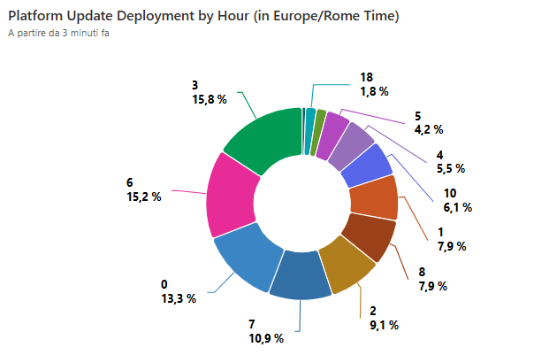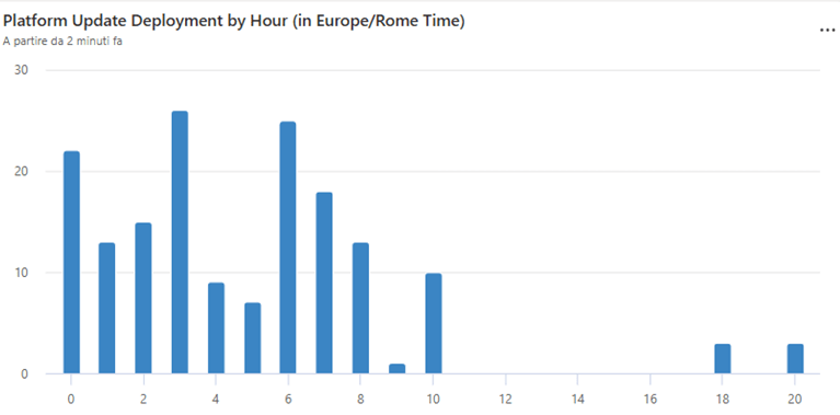 - The statistically best period of 6 hours to set the update window to also include most platform hotfixes is between 2 AM to 8 AM. But do not keep this as written in the stone, the distribution evidence 3 peaks: 0 – 3 – 6 AM.