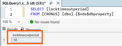 The default value is stored in $ndo$dbproperty table, locktimeoutperiod field (that is set, in Dynamics 365 Business Central 2025 Wave 2 aka v27 Cronus Database, to 10 seconds). See below: