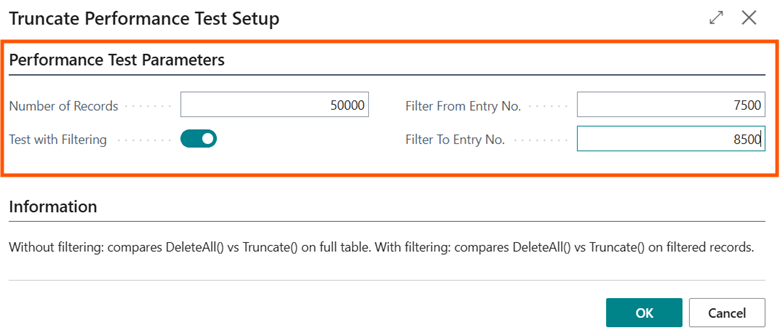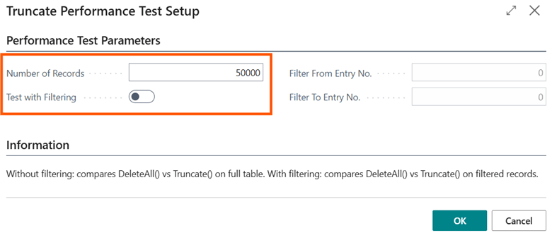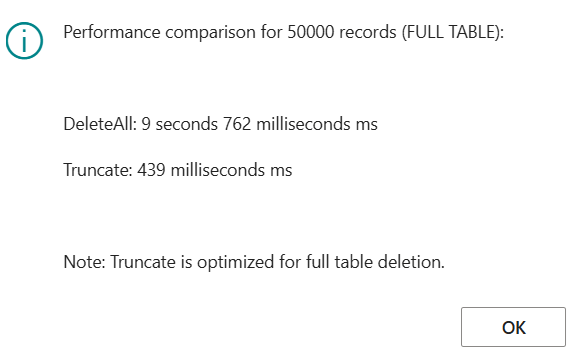 Tests were conducted based on deleting with both methods (DeleteAll and Truncate) and increasing number of records (at 20% intervals, so 200 thousand more records each time), testing both scenarios where the table has only the primary key as well as the scenario with all indexes (SIFTs included) defined by the standard “Item Ledger Entry.”