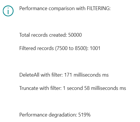 Analyzing results, it has been found that when cleaning a table with few indexes, the truncate method becomes advantageous if deleting at least 50%–60% of the content. If deleting less, the operation of saving and restoring the records we want to keep negates the advantages of Rec.truncate. In such cases, it would be better to privilege row-by-row DeleteAll, instead. “