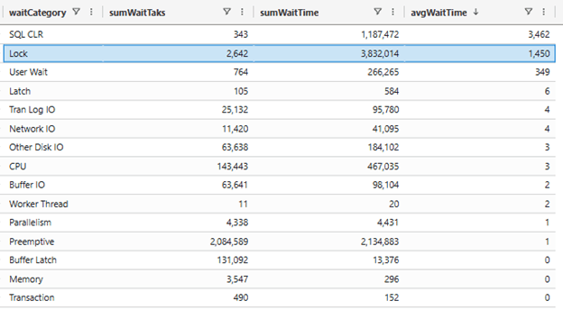 Group of wait type based on the information they gather. E.g. Full Text Search category regroups FT_RESTART_CRAWL, FULLTEXT GATHERER and MSSEARCH wait types. These grouping has been established by Dynamics 365 Business Central Product Group (Server Runtime team).