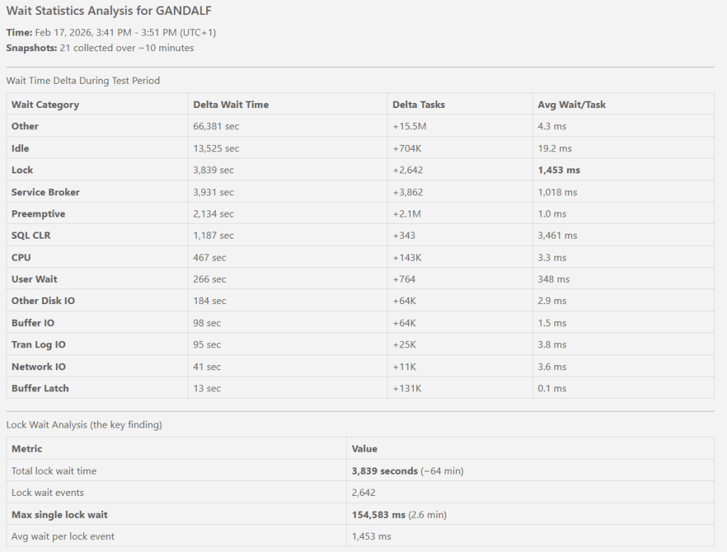 Despite not being even in the Top 10 waiting tasks count, the Lock wait time is quite serious in this scenario and covers 46% of the time tasks were waiting.